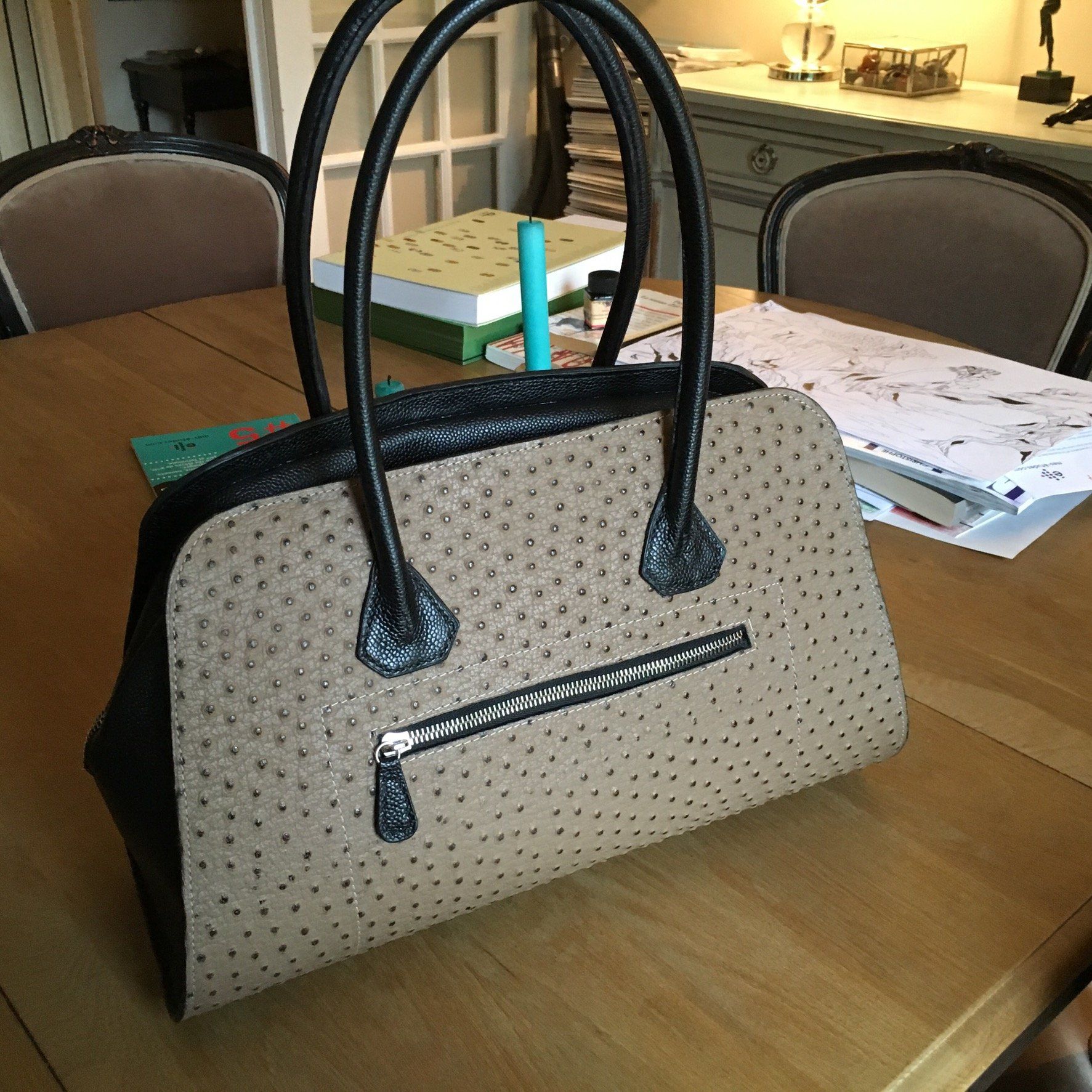 sac cuir, doublé cuir ou tissu, poignées rondes 50cm porté épaule ou main. 2 poches interieures, 1 poche zippée exterieure. 40x32x27x12cm