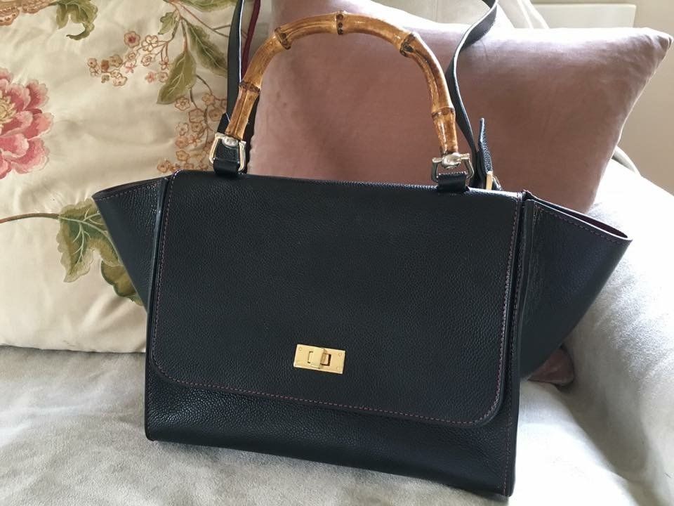 sac cuir, doublé cuir ou tissu, poignées rondes 50cm porté épaule ou main. 2 poches interieures, 1 poche zippée exterieure. 40x32x27x12cm